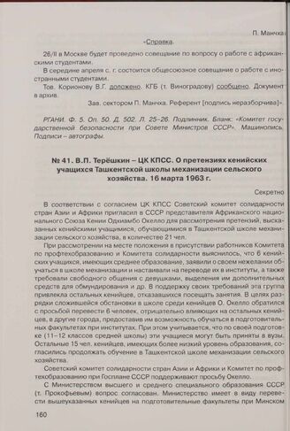 В.П. Терешкин - ЦК КПСС. О претензиях кенийских учащихся Ташкентской школы механизации сельского хозяйства. 16 марта 1963 г.
