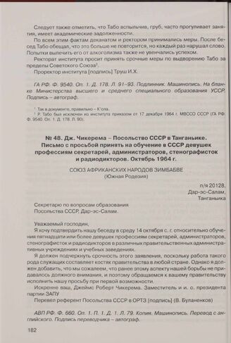 Дж. Чикерема - Посольство СССР в Танганьике. Письмо с просьбой принять на обучение в СССР девушек профессиям секретарей, администраторов, стенографисток и радиодикторов. Октябрь 1964 г. // АВП РФ. Ф. 660. Оп. 1. П. 1. Д. 1. Л. 79. Копия. Машинопись. Перевод с английского. Подпись переводчика - автограф.