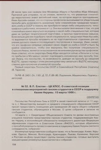 В.П. Елютин - ЦК КПСС. О советской позиции в отношении мероприятий ганских студентов в СССР в поддержку Кваме Нкрумы. 15 марта 1966 г. // РГАНИ. Ф. 5. Оп. 50. Д. 766. Л. 218-219. Подлинник. Машинопись. Подписи - автографы.