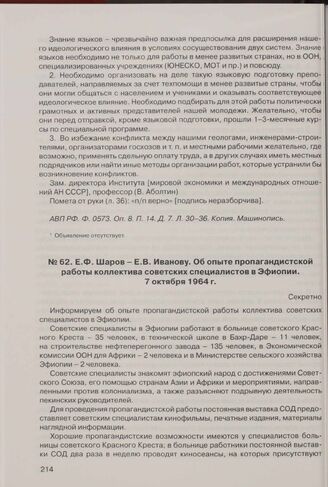 Е.Ф. Шаров - Е.В. Иванову. Об опыте пропагандистской работы коллектива советских специалистов в Эфиопии. 7 октября 1964 г.