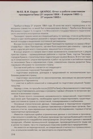 В.И. Седов - ЦК КПСС. Отчет о работе советником президента Ганы (21 апреля 1964 - 9 апреля 1965 г.). 27 апреля 1965 г. // РГАНИ. Ф. 5. Оп. 50. Д. 697. Л. 81-88. Подлинник. Машинопись. Подпись - автограф.