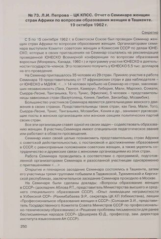 Л.И. Петрова - ЦК КПСС. Отчет о Семинаре женщин стран Африки по вопросам образования женщин в Ташкенте. 19 октября 1962 г. // РГАНИ. Ф. 5. Оп. 55. Д. 438. Л. 134-142. Подлинник. Машинопись. Подписи - автографы.