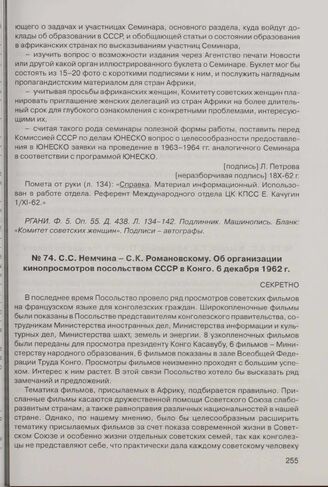 С.С. Немчина - С.К. Романовскому. Об организации кинопросмотров посольством СССР в Конго. 6 декабря 1962 г. // АВП РФ. Ф. 0590. Оп. 4. П. 8. Д. 19. Л. 128-129. Подлинник. Машинопись. Подпись - автограф.