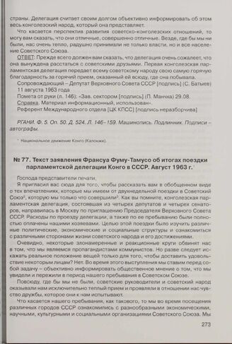 Текст заявления Франсуа Фуму-Тамусо об итогах поездки парламентской делегации Конго в СССР. Август 1963 г.