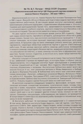 Б.Г. Петрук - МИД СССР. Справка «Идеологический институт ЦК Народной партии конвента имени Кваме Нкрумы». 26 мая 1964 г. // АВП РФ. Ф. 573. Оп. 8. П. 14. Д. 10. Л. 67-69. Подлинник. Машинопись. Подпись - автограф.