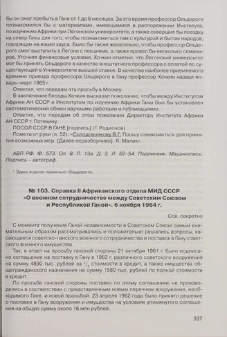 Справка II Африканского отдела МИД СССР «О военном сотрудничестве между Советским Союзом и Республикой Ганой». 6 ноября 1964 г. // АВП РФ. Ф. 0573. Оп. 8. П. 15. Д. 9. Л. 85-87. Подлинник. Машинопись.