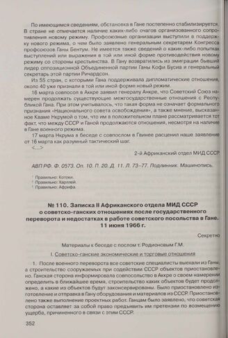 Записка II Африканского отдела МИД СССР о советско-ганских отношениях после государственного переворота и недостатках в работе советского посольства в Гане. 11 июня 1966 г. // АВП РФ. Ф. 0573. Оп. 10. П. 20. Д. 10. Л. 31-37. Подлинник. Машинопись.