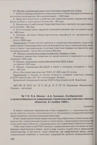 Я.А. Малик - А.А. Громыко. Соображения о целесообразности завершения строительства советско-ганских объектов. 21 ноября 1966 г. // АВП РФ. Ф. 0573. Оп. 10. П. 20. Д. 10. Л. 44. Подлинник. Машинопись. Подпись - автограф.