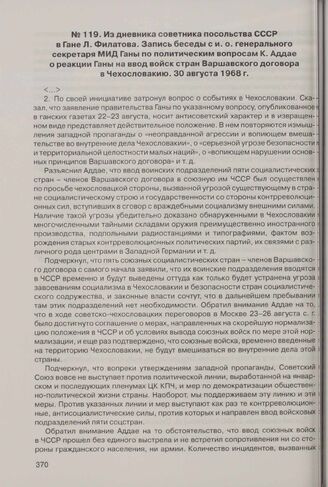 Из дневника советника посольства СССР в Гане Л. Филатова. Запись беседы с и.о. генерального секретаря МИД Ганы по политическим вопросам К. Аддае о реакции Ганы на ввод войск стран Варшавского договора в Чехословакию. 30 августа 1968 г. // АВП РФ. Ф. 573. Оп. 12. П. 18. Д. 1. Л. 167, 168-172. Подлинник. Машинопись. Подпись - автограф.