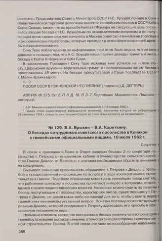 В.А. Брыкин - В.А. Кареткину. О беседах сотрудников советского посольства в Конакри с гвинейскими официальными лицами. 10 июля 1962 г.