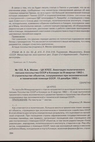 Я.А. Малик - ЦК КПСС. Аннотация политического письма посольства СССР в Конакри за III квартал 1962 г. О строительстве объектов, сооружаемых при экономической и технической помощи СССР. 19 декабря 1962 г. // РГАНИ. Ф. 5. Оп. 50. Д. 415. Л. 323, 325-327. Подлинник. Машинопись. Подписи - автографы.