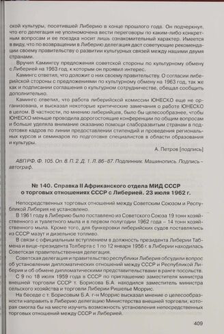 Справка II Африканского отдела МИД СССР о торговых отношениях СССР с Либерией. 23 июля 1962 г. // АВП РФ. Ф. 105. Оп. 9. П. 3. Д. 1. Л. 60-64. Копия. Машинопись.