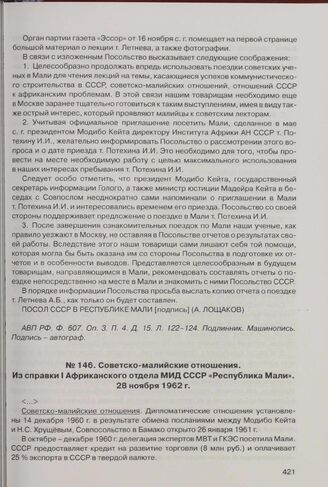 Советско-малийские отношения. Из справки I Африканского отдела МИД СССР «Республика Мали». 28 ноября 1962 г. // АВП РФ. Ф. 607. Оп. 3. П. 4. Д. 11. Л. 46-49. Подлинник. Машинопись. Подпись - автограф.