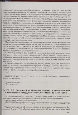 Д.Д. Дегтярь - Л.Ф. Ильичеву. Справка об экономическом и техническом сотрудничестве СССР с Мали. 15 июля 1968 г.