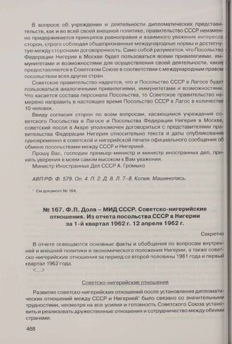 Ф.П. Доля - МИД СССР. Советско-нигерийские отношения. Из отчета посольства СССР в Нигерии за 1-й квартал 1962 г. 12 апреля 1962 г. // РГАНИ. Ф. 5. Оп. 50. Д. 416. Л. 125, 148-155. Подлинник. Машинопись. Подпись - автограф.