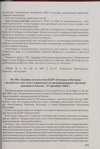 Справка посольства СССР «Отклики в Нигерии на работу советского павильона на международной торговой ярмарке в Лагосе». 27 декабря 1962 г. // АВП РФ. Ф. 579. Оп. 5. Д. 18. Л. 13-24. Подлинник. Машинопись. Подпись - автограф.