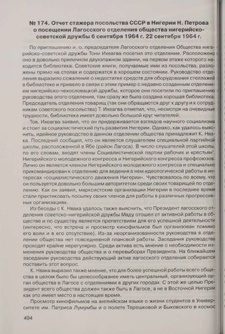 Отчет стажера посольства СССР в Нигерии Н. Петрова о посещении Лагосского отделения общества нигерийско-советской дружбы 6 сентября 1964 г. 22 сентября 1964 г.