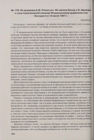 Из дневника А.И. Романова. Из записи бесед с О. Аволово о советской военной помощи Федеральному правительству Нигерии. 5 и 12 июля 1967 г. // АВП РФ. Ф. 0579. Оп. 11. П. 13. Д. 4. Л. 48, 50-52. Подлинник. Машинопись. Подпись - автограф.