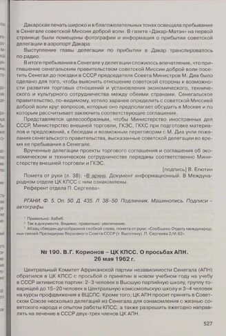 В.Г. Корионов - ЦК КПСС. О просьбах АПН. 26 мая 1962 г. // РГАНИ. Ф. 4. Оп. 18. Д. 159. Л. 67-68. Подлинник. Машинопись. Подпись - автограф.