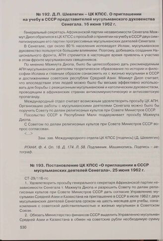 Постановление ЦК КПСС «О приглашении в СССР мусульманских деятелей Сенегала». 25 июня 1962 г.