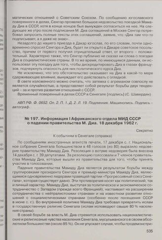 Информация I Африканского отдела МИД СССР о падении правительства М. Диа. 18 декабря 1962 г. // АВП РФ. Ф. 0652. Оп. 2. П. 1. Д. 4. Л. 7-9. Подлинник. Машинопись. Подпись - автограф.