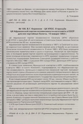 В.Г. Корионов - ЦК КПСС. О просьбе ЦК Африканской партии независимости изготовить в СССР для нее партийные билеты. 10 января 1963 г. // РГАНИ. Ф. 4. Оп. 18. Д. 304. Л. 37. Подлинник. Машинопись. Подпись - автограф.