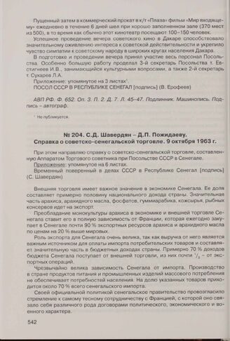 С.Д. Шавердян - Д.П. Пожидаеву. Справка о советско-сенегальской торговле. 9 октября 1963 г. // АВП РФ. Ф. 652. Оп. 3. П. 2. Д. 5. Л. 2-3, 5-8. Подлинник. Машинопись. Подписи - автографы.