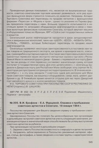 В.И. Ерофеев - Е.А. Фурцевой. Справка о пребывании советских артистов в Сенегале. 18 января 1964 г. // АВП РФ. Ф. 652. Оп. 4. П. 3. Д. 15. Л. 42-46. Подлинник. Машинопись. Подписи - автографы.