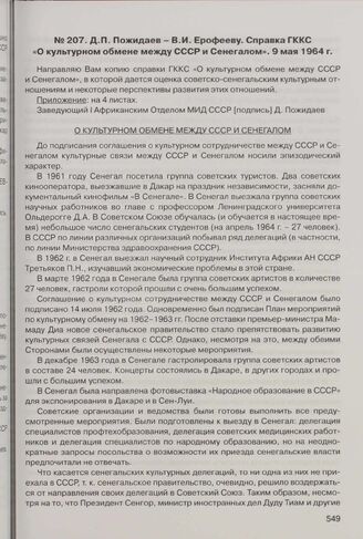 Д.П. Пожидаев - В.И. Ерофееву. Справка ГККС «О культурном обмене между СССР и Сенегалом». 9 мая 1964 г. // АВП РФ. Ф. 652. Оп. 4. П. 3. Д. 15. Л. 4-8. Копия. Машинопись. Подписи - автографы.