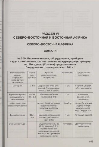 Перечень машин, оборудования, приборов и других экспонатов для поставки на международную ярмарку в г. Могадишо (Сомали) предприятиями Свердловского совнархоза на 1961 г. // ГАСО. Ф. Р-1966. Оп. 1. Д. 1060. Л. 73-78. Копия. Машинопись.