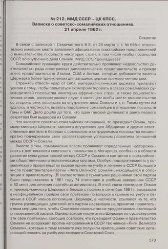 МИД СССР - ЦК КПСС. Записка о советско-сомалийских отношениях. 21 апреля 1962 г.