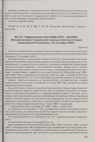 I Африканский отдел МИД СССР - ЦК КПСС. Экономическая и техническая помощь Советского Союза Сомалийской Республике. 23 сентября 1963 г. // РГАНИ. Ф. 5. Оп. 30. Д. 423. Л. 93-97. Подлинник. Машинопись. Подпись - автограф.