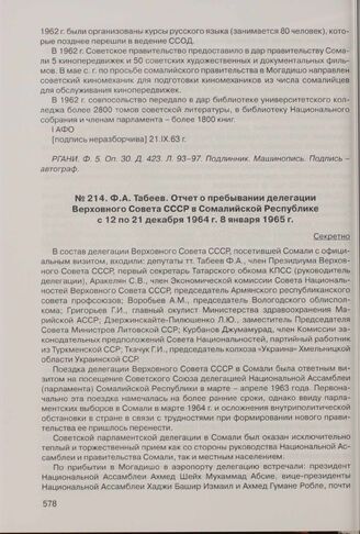 Ф.А. Табеев. Отчет о пребывании делегации Верховного Совета СССР в Сомалийской Республике с 12 по 21 декабря 1964 г. 8 января 1965 г. // РГАНИ. Ф. 5. Оп. 50. Д. 699. Л. 1-17. Подлинник. Машинопись. Подпись - автограф.