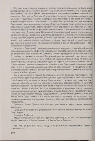 Запись беседы членов советско-сомалийской исторической экспедиции с президентом ВРС Сомалийской Демократической Республики генерал-майором М.С. Барре. 22 сентября 1971 г. // АВП РФ. Ф. 581. П. 17. Оп. 15. Д. 8. Л. 33-37. Подлинник. Машинопись. Подпись - автограф.