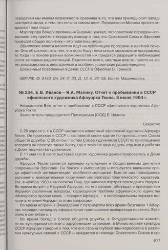 Е.В. Иванов - Я.А. Малику. Отчет о пребывании в СССР эфиопского художника Афэуорка Текле. 8 июля 1964 г. // АВП РФ. Ф. 0143. Оп. 24. П. 33. Д. 13. Л. 6-9. Копия. Машинопись.