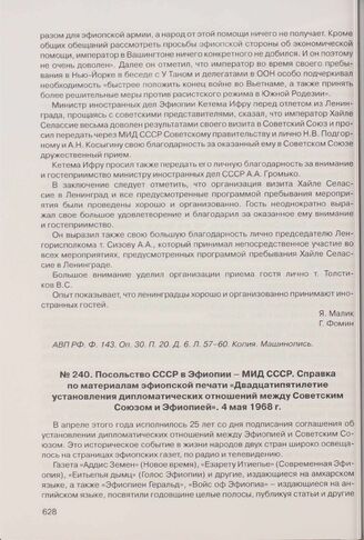 Посольство СССР в Эфиопии - МИД СССР. Справка по материалам эфиопской печати «Двадцатипятилетие установления дипломатических отношений между Советским Союзом и Эфиопией». 4 мая 1968 г.