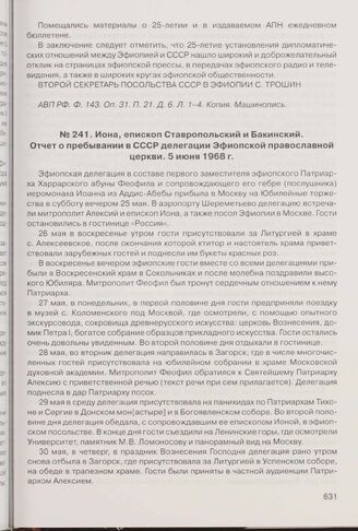 Иона, епископ Ставропольский и Бакинский. Отчет о пребывании в СССР делегации Эфиопской православной церкви. 5 июня 1968 г.