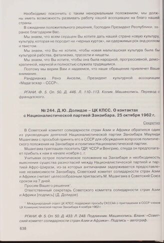 Д.Ю. Долидзе - ЦК КПСС. О контактах с Националистической партией Занзибара. 25 октября 1962 г. // РГАНИ. Ф. 5. Оп. 50. Д. 433. Л. 248. Подлинник. Машинопись. Подпись - автограф.