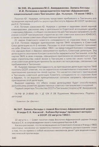 Запись беседы с главой Восточно-Африканской церкви Уганды С.К. Касасой. Кабака Буганды проявляет интерес к СССР. 22 августа 1963 г. // АВП РФ. Ф. 582. Оп. 6. П. 2. Д. 2. Л. 16-17. Подлинник. Подпись - автограф.