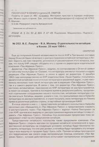В.С. Лавров - Я.А. Малику. О деятельности китайцев в Кении. 25 мая 1964 г. // РГАНИ. Ф. 5. Оп. 50. Д. 604. Л. 76-77. Подлинник. Машинопись. Подпись - автограф.