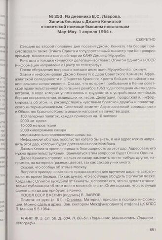 Из дневника В.С. Лаврова. Запись беседы с Джомо Кениатой о советской помощи бывшим повстанцам May-May. 1 апреля 1964 г.