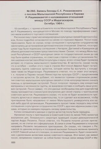 Запись беседы С.К. Романовского с послом Мальгашской Республики в Париже Р. Рацимамангой о налаживании отношений между СССР и Мадагаскаром. Октябрь 1964 г. // РГАНИ. Ф. 5. Оп. 50. Д. 644. Л. 236-238. Подлинник. Машинопись. Подписи - автографы.