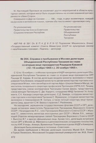 Справка о пребывании в Москве делегации Объединенной Республики Танзания во главе со вторым вице-президентом Рашидом Кававой (12-15 ноября 1965 г.). 20 ноября 1965 г. // АВП РФ. Ф. 591. Оп. 8. П. 4. Д. 4. Л. 10-14. Подлинник. Машинопись. Подписи - автографы.