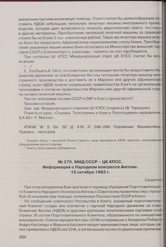 МИД СССР - ЦК КПСС. Информация о Народном конгрессе Анголы. 15 октября 1962 г. // РГАНИ. Ф. 5. Оп. 50. Д. 415. Л. 274. Подлинник. Машинопись. Подпись - автограф.