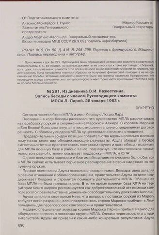 Из дневника О.И. Нажесткина. Запись беседы с членом Руководящего комитета МПЛА Л. Ларой. 28 января 1963 г. // РГАНИ. Ф. 5. Оп. 50. Д. 502. Л. 78-82. Копия. Машинопись. Подпись заверителя - автограф.