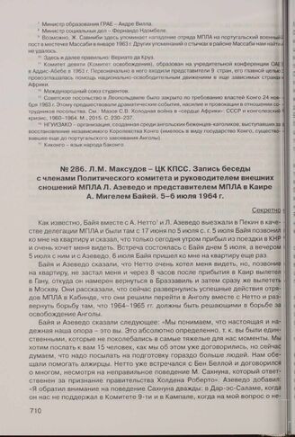 Л.М. Максудов - ЦК КПСС. Запись беседы с членами Политического комитета и руководителем внешних сношений МПЛА Л. Азеведо и представителем МПЛА в Каире А. Мигелем Байей. 5-6 июля 1964 г. // РГАНИ. Ф. 5. Оп. 50. Д. 642. Л. 119-122. Подлинник. Машинопись. Подпись - автограф.