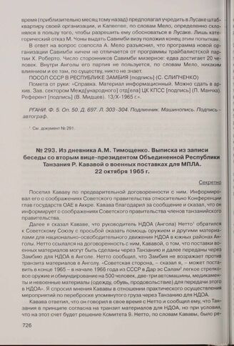Из дневника А.М. Тимощенко. Выписка из записи беседы со вторым вице-президентом Объединенной Республики Танзания Р. Кававой о военных поставках для МПЛА. 22 октября 1965 г.