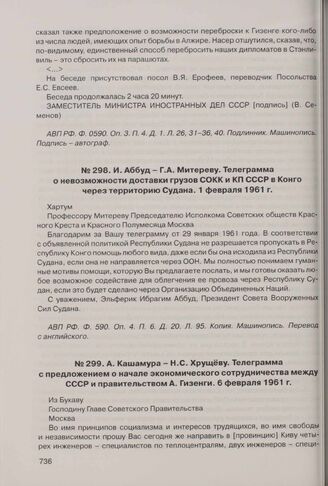 А. Кашамура - Н.С. Хрущеву. Телеграмма с предложением о начале экономического сотрудничества между СССР и правительством А. Гизенги. 6 февраля 1961 г. // АВП РФ. Ф. 590. Оп. 4. П. 5. Д. 11. Л. 85. Копия. Машинопись. Перевод с французского (исправленный вариант).