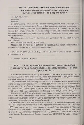Справка Договорно-правового отдела МИД СССР «К вопросу о правительстве Конго, возглавляемом А. Гизенгой». 16 февраля 1961 г. // АВП РФ. Ф. 0590. Оп. 4. П. 5. Д. 11. Л. 148-149. Подлинник. Машинопись. Подпись - автограф.