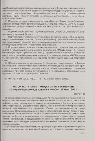 В.С. Силкин - МИД СССР. Из политписьма «О переговорах между Адулой и Чомбе». 28 мая 1962 г.